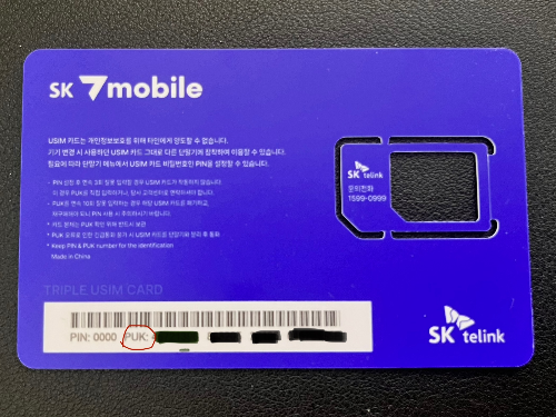 PUK(Personal Unblocking Key) 번호는 유심 PIN 번호를 3회 이상 잘못 입력하여 유심이 잠긴 경우, 이를 해제하기 위해 필요한 8자리 숫자이다. 최초 유심 구매 시, 유심이 부착되어 있던 플라스틱 카드에 PUK 번호가 기재되어 있다는 사실!