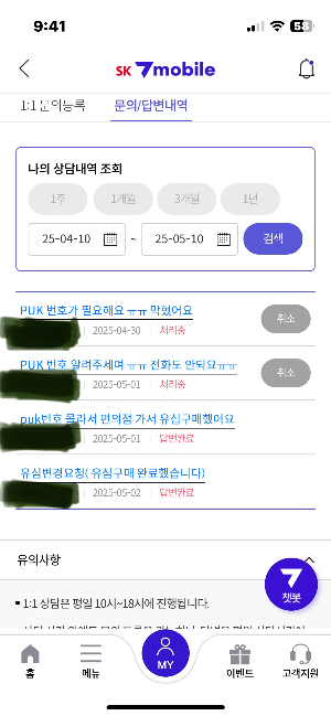 그래서 세븐모바일 홈페이지에 접속해서 문의를 여러 번 남기게 된다.