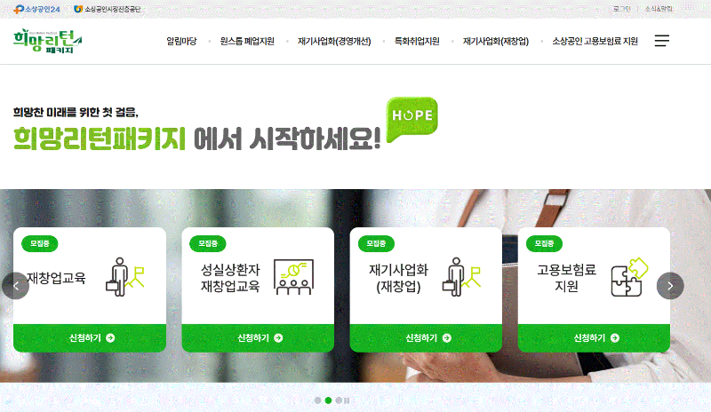 - 사이트 접속: 희망리턴패키지 또는 소상공인마당 회원 가입.