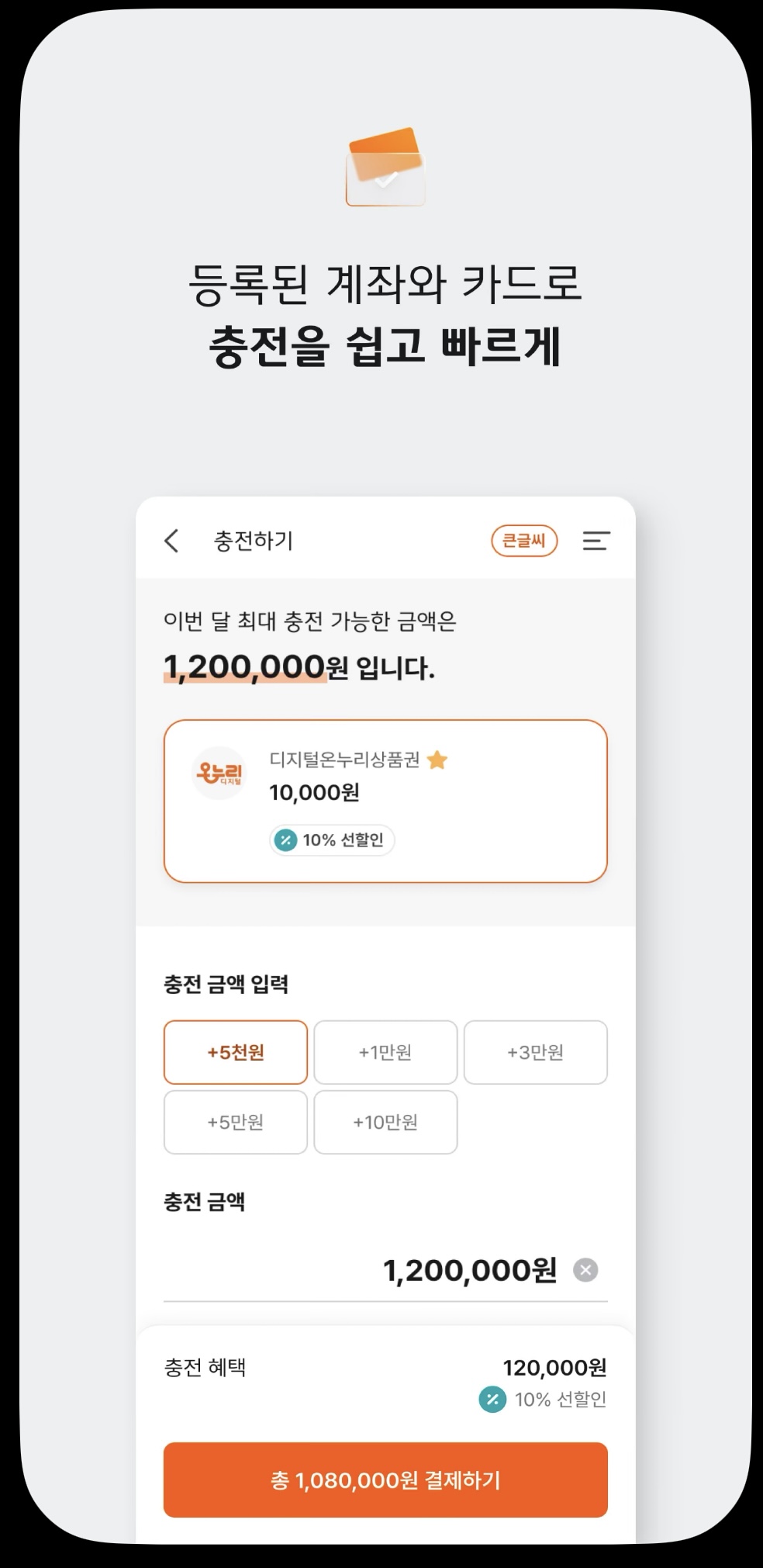 원하는 금액(1만 원~200만 원)을 선택해 충전하세요. 결제 시 15% 할인 자동 적용(예: 10만 원 상품권 → 8만 5천 원 결제). 주의: 월 구매 한도는 200만 원이며, 할인율은 이벤트 기간에 따라 변동 가능.