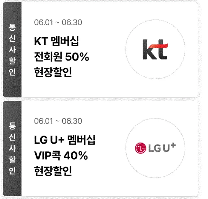 - 통신사 멤버십: SKT, KT, LG U+ 멤버십으로 20~30% 할인. 앱에서 바코드 제시.