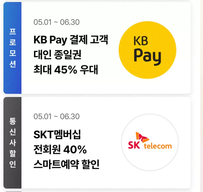 제휴카드, 온라인 예약, 통신사 혜택으로